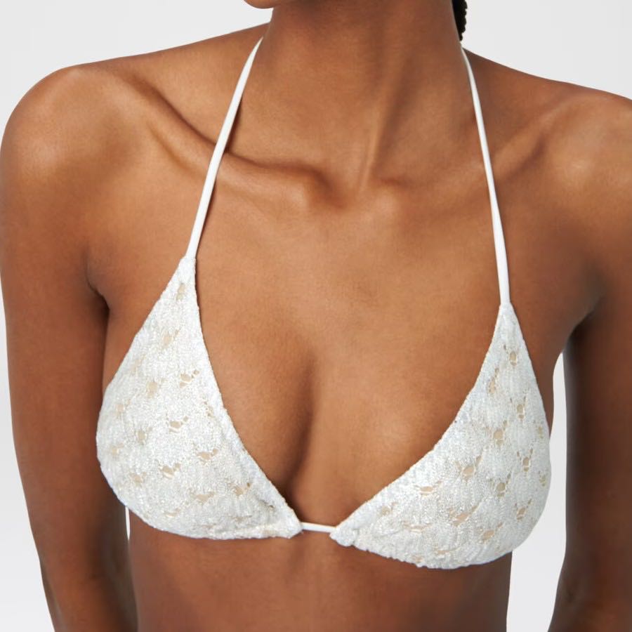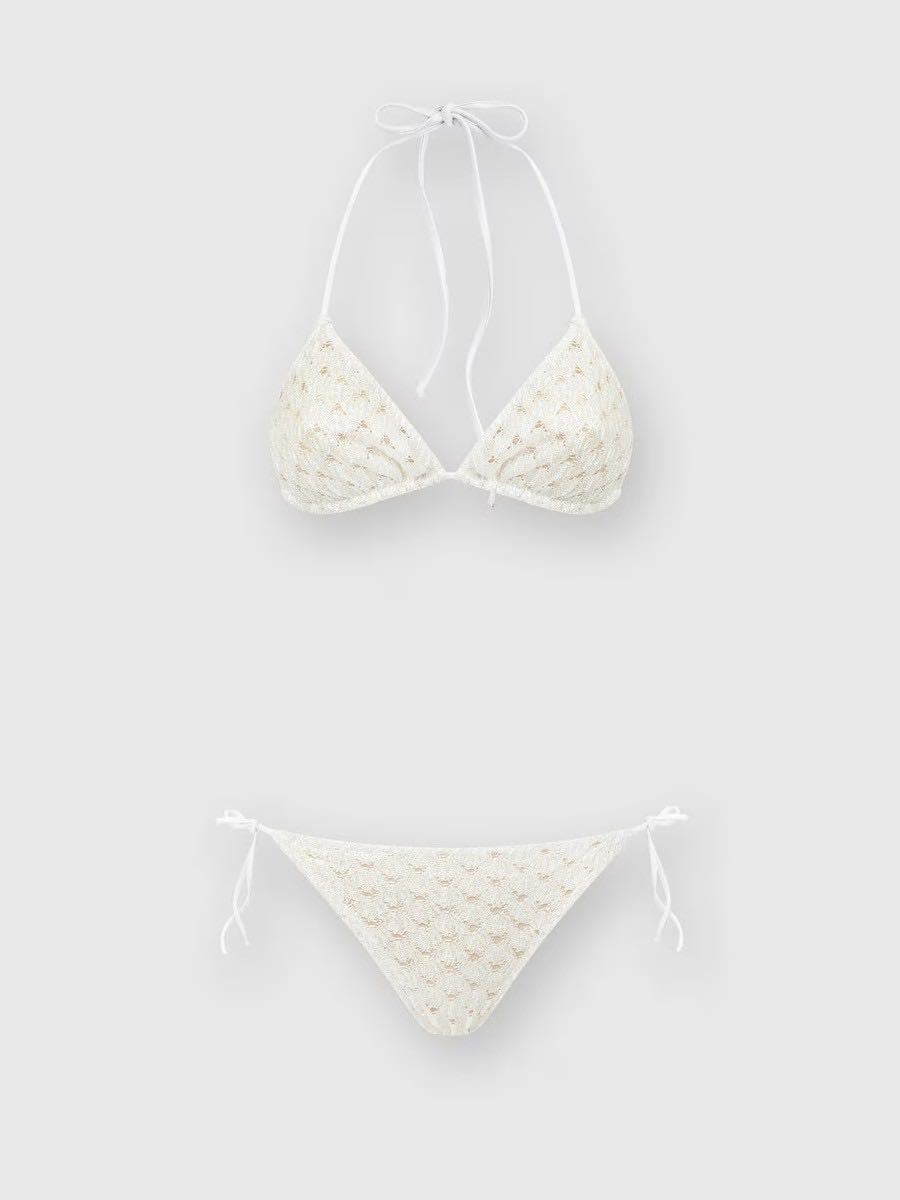 The Missoni metallic bikini features a stunning lurex fabric that shimmers in the light, enhancing your beach look with a touch of glamour. Its classic triangle top and adjustable bottoms provide a flattering fit, ensuring comfort and style. Perfect for sunbathing or swimming, this bikini is a fashionable addition to any summer wardrobe.