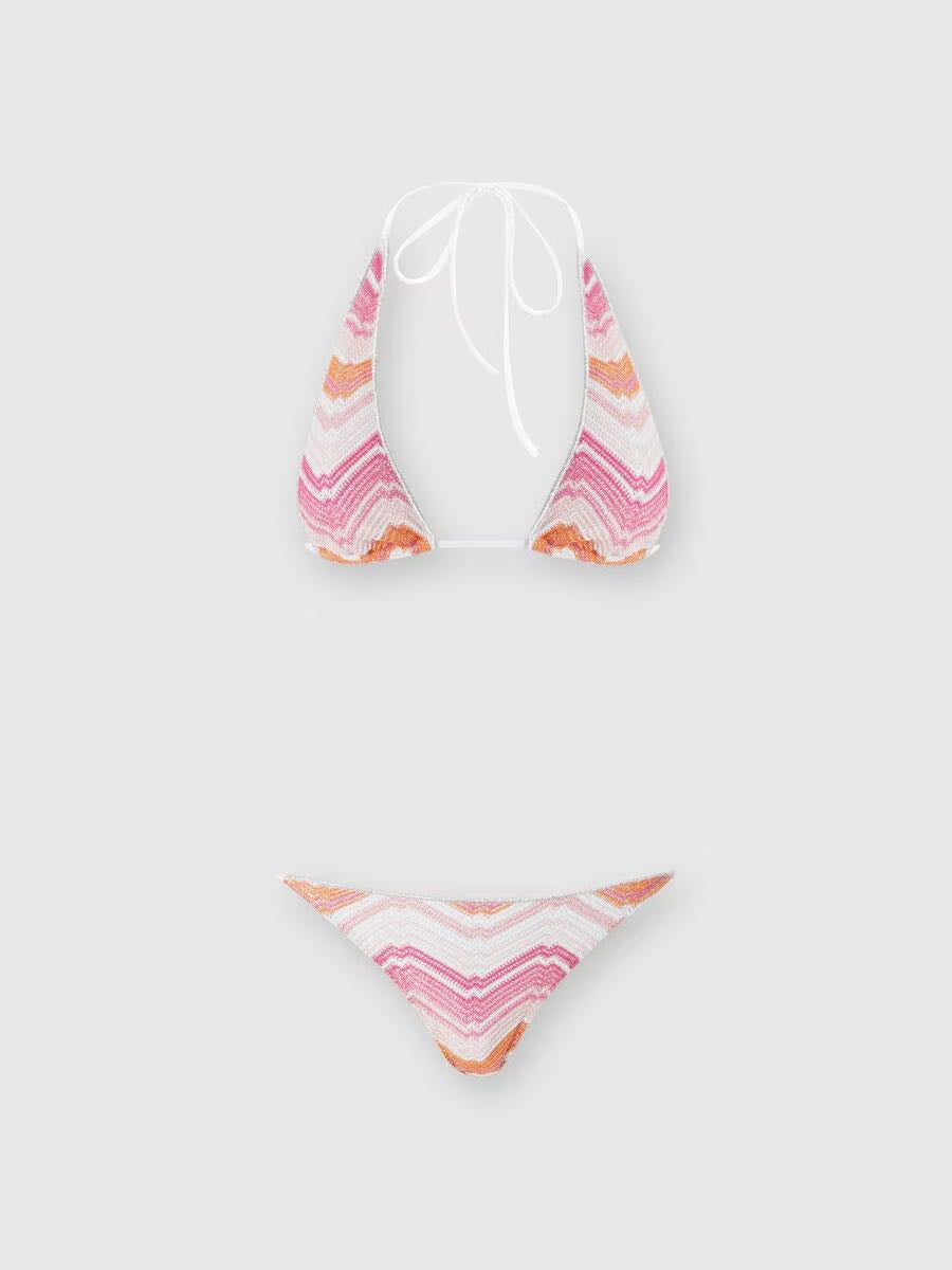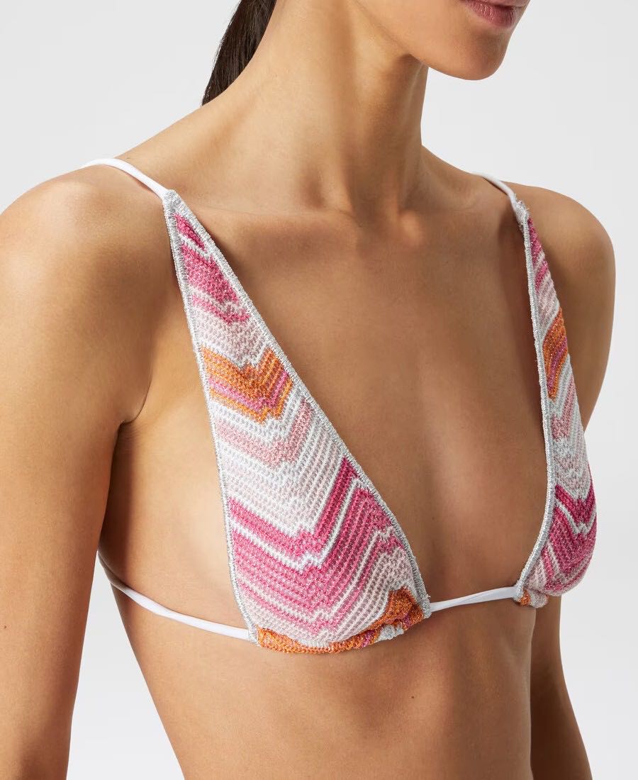 Missoni bikini triangle, featuring a vibrant zigzag pattern in shades of pink and orange. This chic two-piece set is crafted from high-quality materials, offering both comfort and support. The adjustable ties ensure a perfect fit, while the distinctive design makes it a standout choice for any summer getaway.