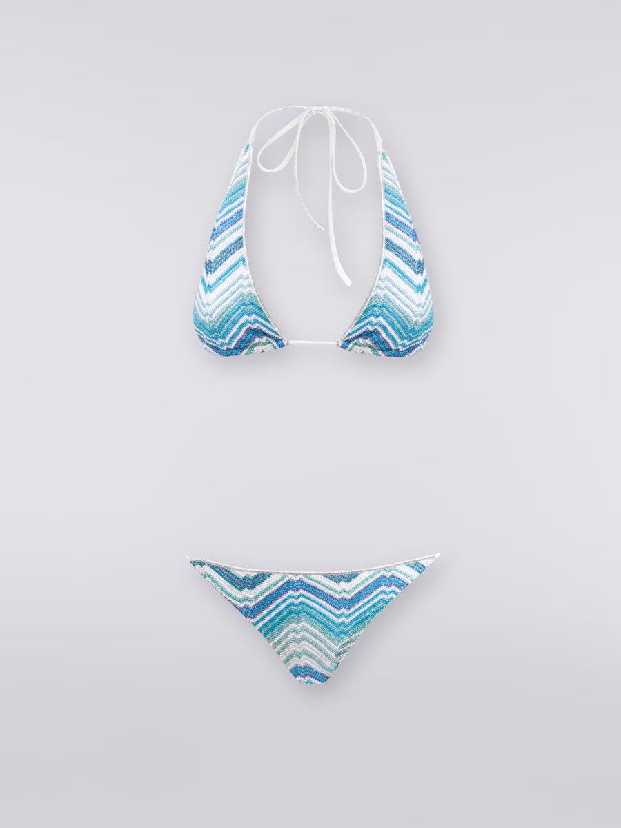 Missoni bikini in a striking blue variant that features a vibrant chevron pattern. The triangle top offers adjustable ties for a customizable fit, while the matching bottom ensures comfort and style at the beach or poolside. Made from high-quality materials, this bikini not only provides a flattering silhouette but also retains its shape and color after exposure to sun and water. Perfect for sunbathing or making a splash, this bikini is a must-have for fashion-forward beachgoers.