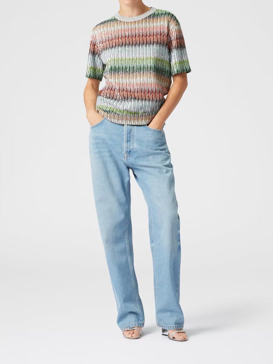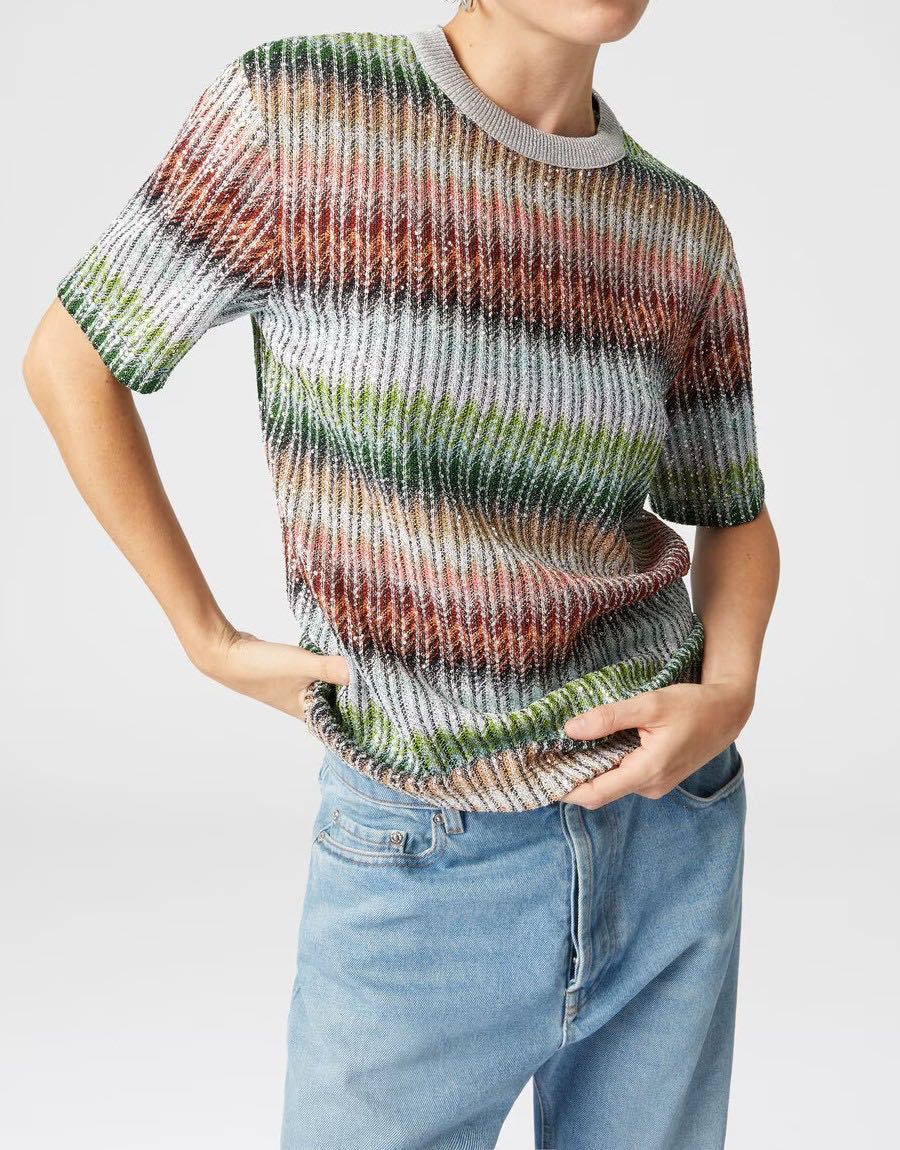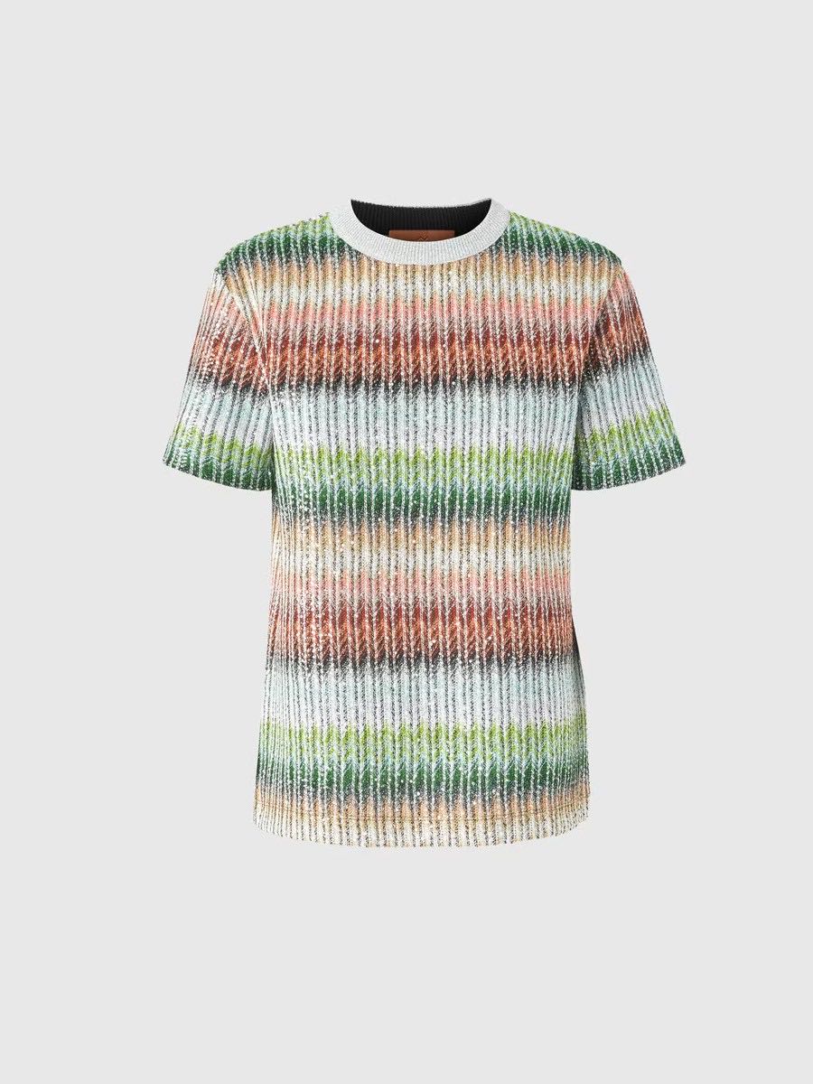 The Missoni Caperdoni t-shirt features a vibrant striped design embellished with sequins, providing a touch of sparkle to your wardrobe. Its comfortable fit, soft fabric, and unique color palette make it a versatile piece perfect for both casual outings and special occasions. The stylish ribbed texture and attention to detail reflect Missoni’s signature craftsmanship, ensuring you stand out in any crowd.