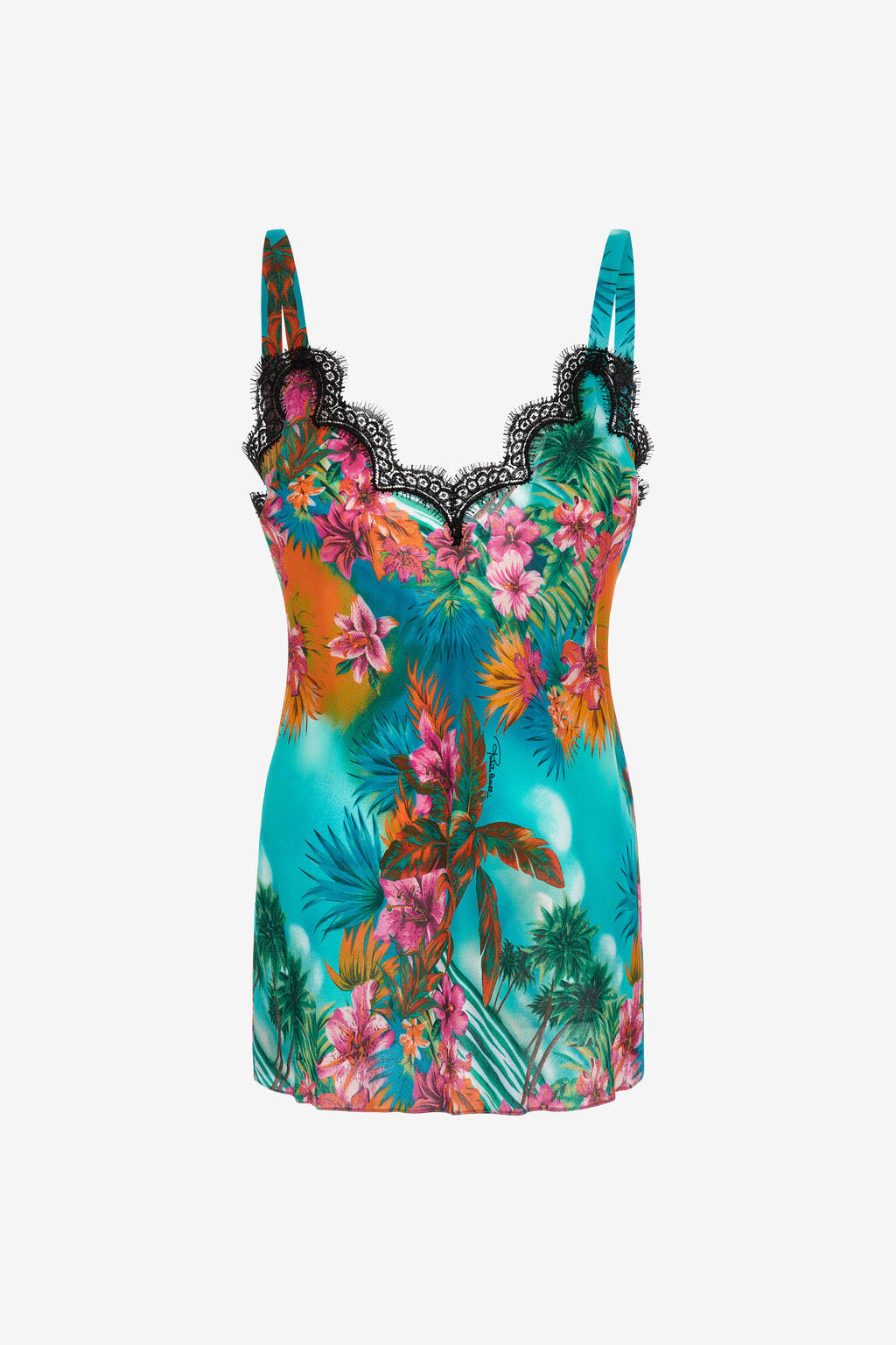 This Hawaii print top by Roberto Cavalli features a vibrant floral design, lace detailing around the neckline, and a slim fit perfect for summer outings. Ideal for a statement look with a tropical flair.