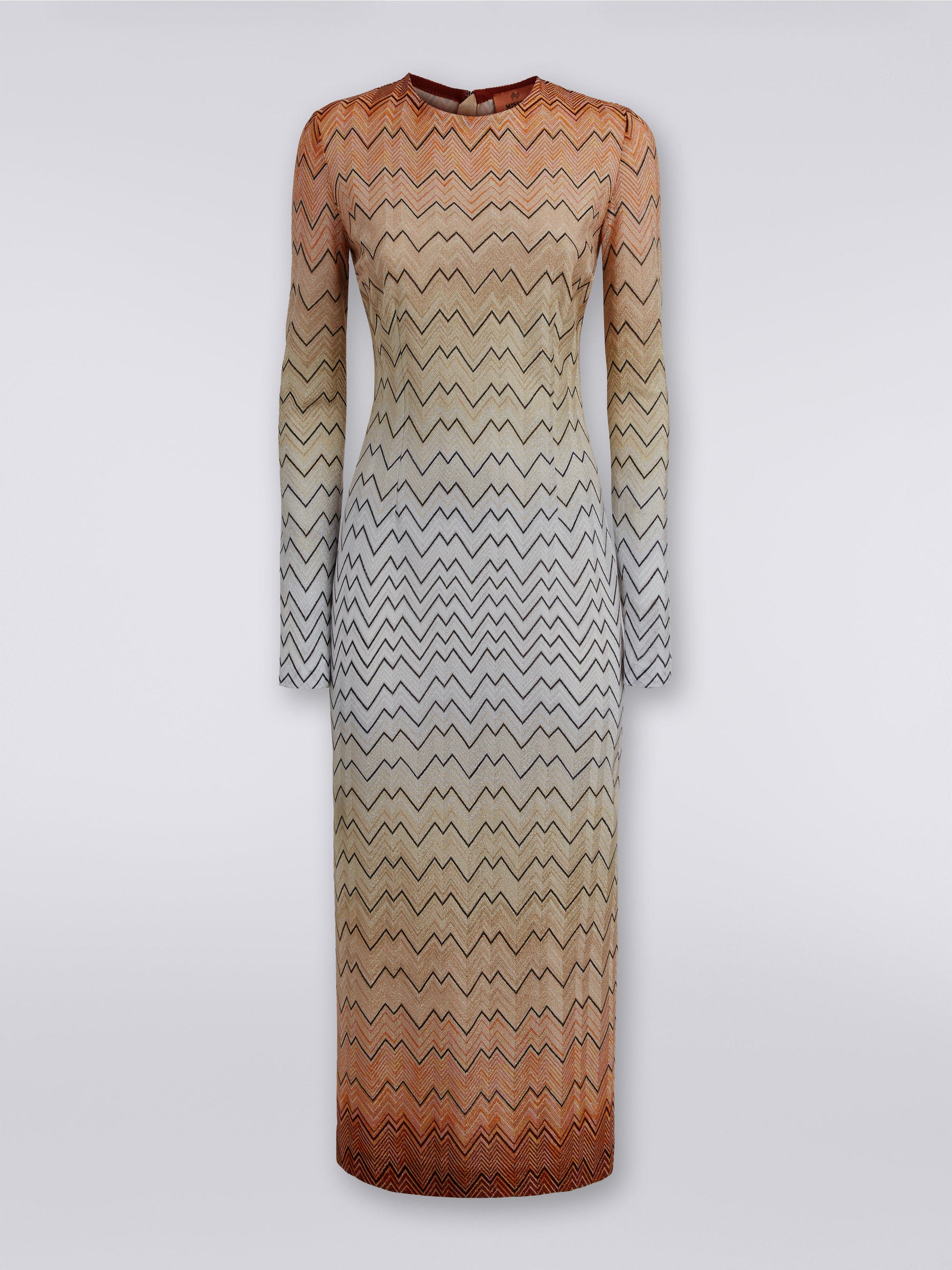 Elevate your style with the Missoni long sleeve lurex dress, featuring a stunning chevron pattern in warm gradient tones. Made from luxurious lurex fabric, this dress combines comfort and elegance, perfect for any occasion. Its fitted silhouette and long sleeves create a flattering look, while the unique design ensures you stand out in the crowd.