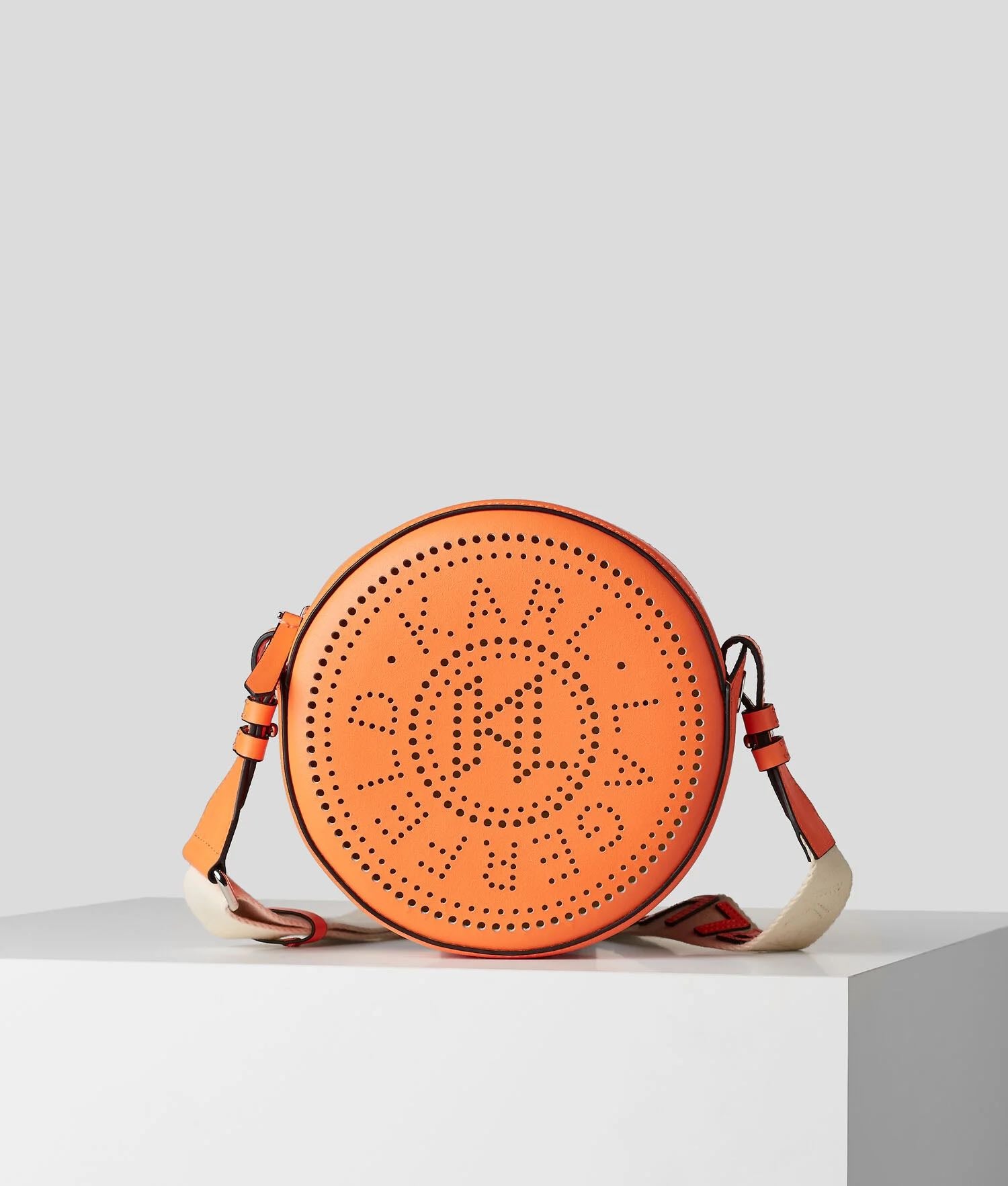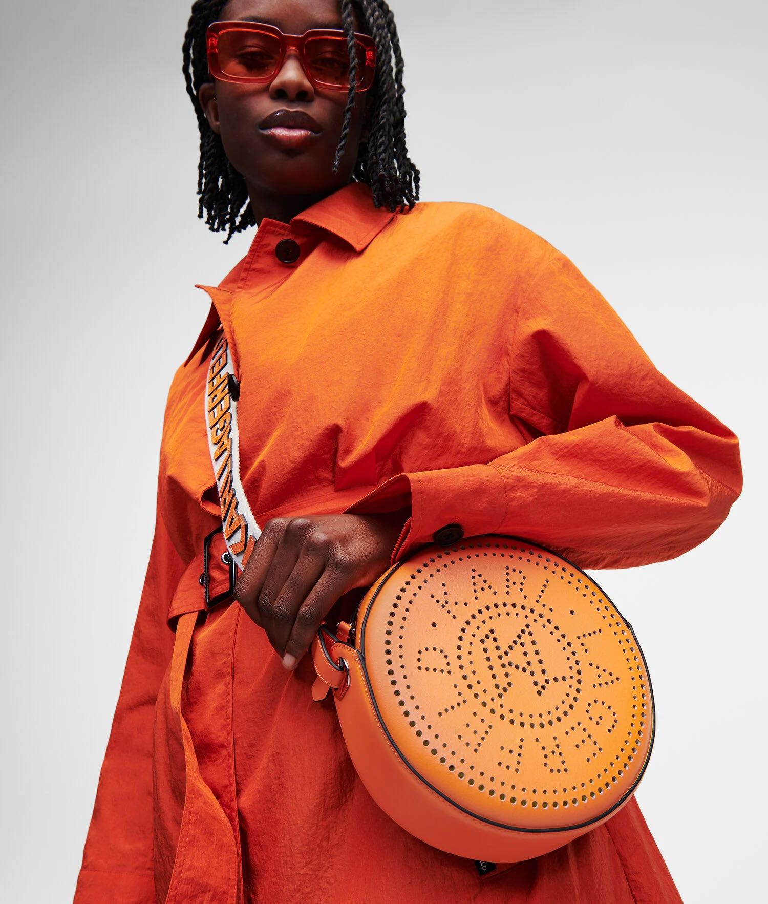 This stylish Karl Lagerfeld Women round bag in vibrant orange features a perforated logo design, adjustable shoulder strap for comfort, and a minimalist yet chic look perfect for any occasion.