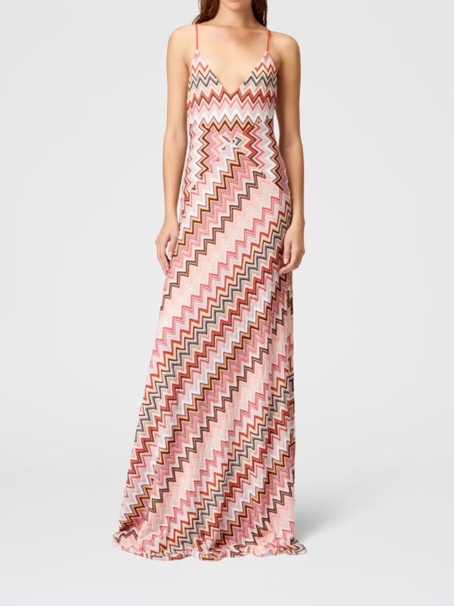 This stunning long dress by Missoni features a vibrant zigzag pattern that captures attention with its unique patchwork design. The lightweight fabric offers comfort and fluid movement, while the stylish spaghetti straps provide an elegant touch. Perfect for summer outings or beach parties, this dress blends fashion with a laid-back vibe, making it a versatile addition to any wardrobe.