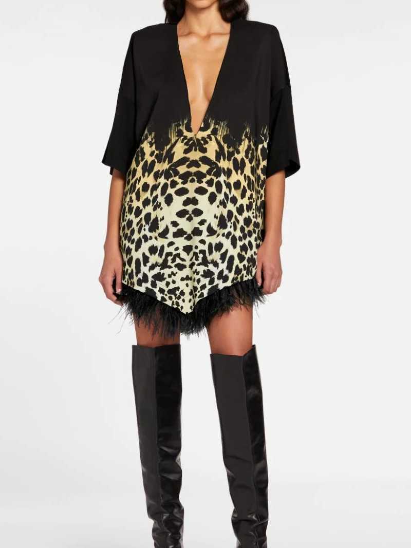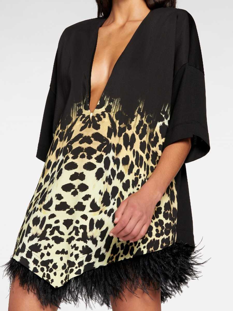 Roberto Cavalli presents a bold leopard print dress featuring a deep V-neckline and a loose, relaxed fit. The hem is adorned with feathered details, adding a touch of sophistication and playful elegance. Ideal for making a statement.